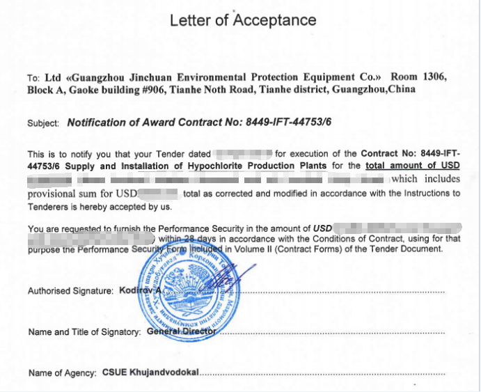 近日,我司收到塔吉克斯坦杜尚別水廠的中標(biāo)通知書,確定我司為該項(xiàng)目次氯酸鈉發(fā)生器的供應(yīng)商。