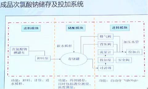 成品次氯酸鈉的進料、儲存和加料的基本流程如下圖: