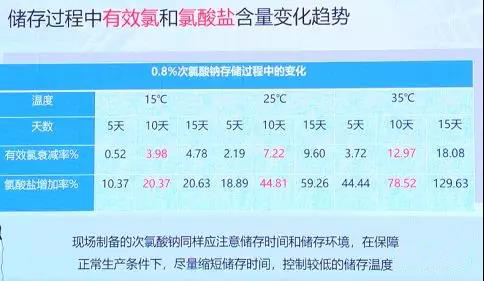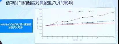 儲存過程里面低濃度率的0.8%左右的次氯酸鈉,有效氯的變化情況和氯酸鹽的變化情況,可以看得出來溫度越高,有效氯降低得越快,氯酸鹽增加得越快,跟成品次氯酸鈉其實是一樣的。