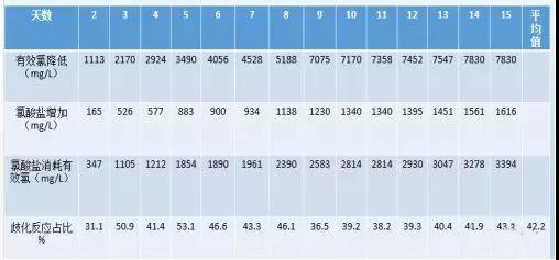 次氯酸鈉的歧化反應和分解反應同時發(fā)生,按照有效氯降低的情況和氯酸鹽增加的情況算出來歧化反應所占的比例,結(jié)果顯示15℃的時候歧化反應大概占42.2%。