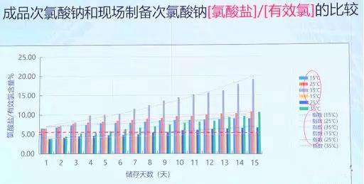 成品次氯酸鈉和現(xiàn)場制備次氯酸鈉氯酸鹽有效氯比值在不同溫度下的比較(15℃、25℃、35℃)結(jié)果看出,雖然絕對值不一樣,但是比率沒有太大差別,所以不管成品次氯酸鈉還是現(xiàn)場制備次氯酸鈉都會存在氯酸鹽和有效氯的比值隨著儲存時間增加的問題。
