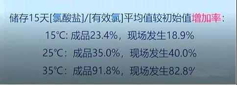 把15℃、25℃、35℃的結(jié)果挑出來,發(fā)現(xiàn)35℃儲存10天的時候有效氯衰減了近13%,同時氯酸鹽含量增加了近80%。